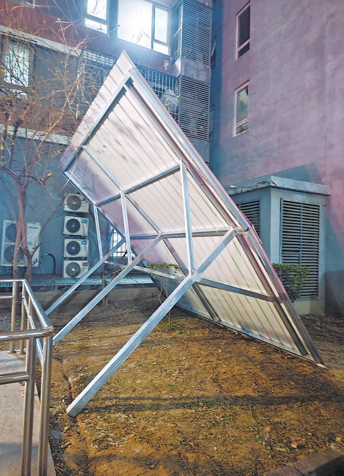 物业工作人员告诉记者,前几天刮大风时,他们在巡查过程中发现8号楼单元门前的自行车棚出现明显倾斜、摇晃,存在随时倾倒的隐患。为保障居民的人身及财产安全,物业紧急组织专业人员对该车棚实施拆除。“最近大风天气多发,我们会对小区其他车棚做进一步的安全检查,尽快排除类似隐患。”