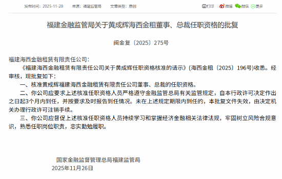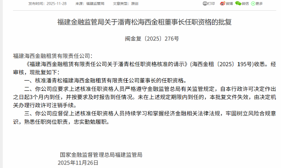 11月28日金融一线消息,福建金融监管局发布批复,核准潘青松福建海西金融租赁有限责任公司董事长的任职资格,核准黄成辉福建海西金融租赁有限责任公司董事、总裁的任职资格。