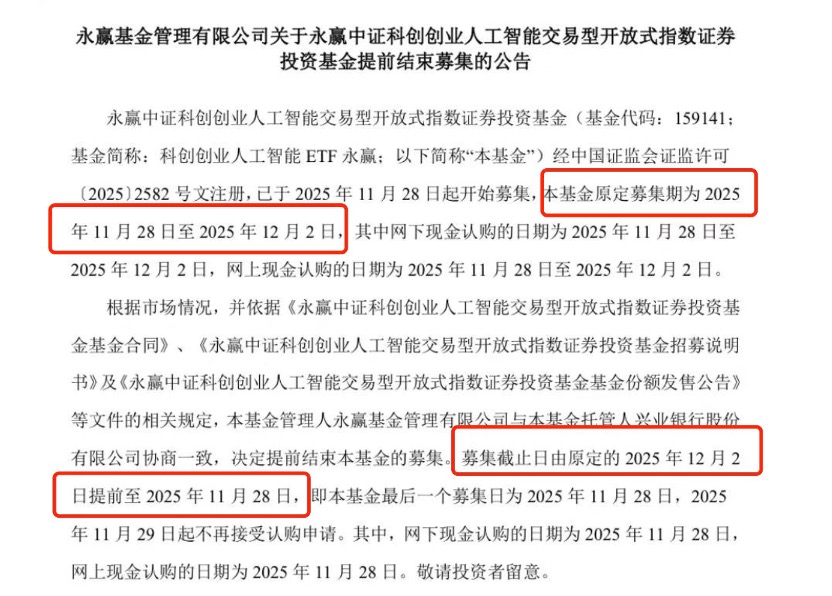 11月28日晚间,永赢基金发布提前结募的公告称,根据市场情况,与基金托管人协商一致后,决定提前结束双创人工智能ETF的募集,该基金原定截止日期从12月2日提前至11月28日。