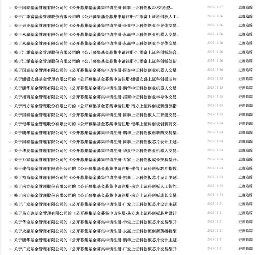 财联社不完全统计显示,自11月21日16只硬科技基金获批以来,短短5天之内,已有多达28只科创相关指数基金上报,覆盖双创人工智能、双创半导体、双创、科创芯片、科创芯片设计、科创新能源、科创创新药细分垂直等领域。