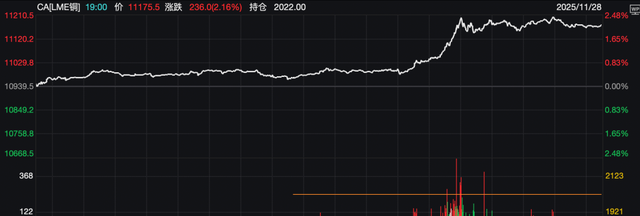 铜价亦创历史新高。行情数据显示,LME铜盘中一度上涨近2.5%,达到每吨11210.50美元,触及纪录新高。