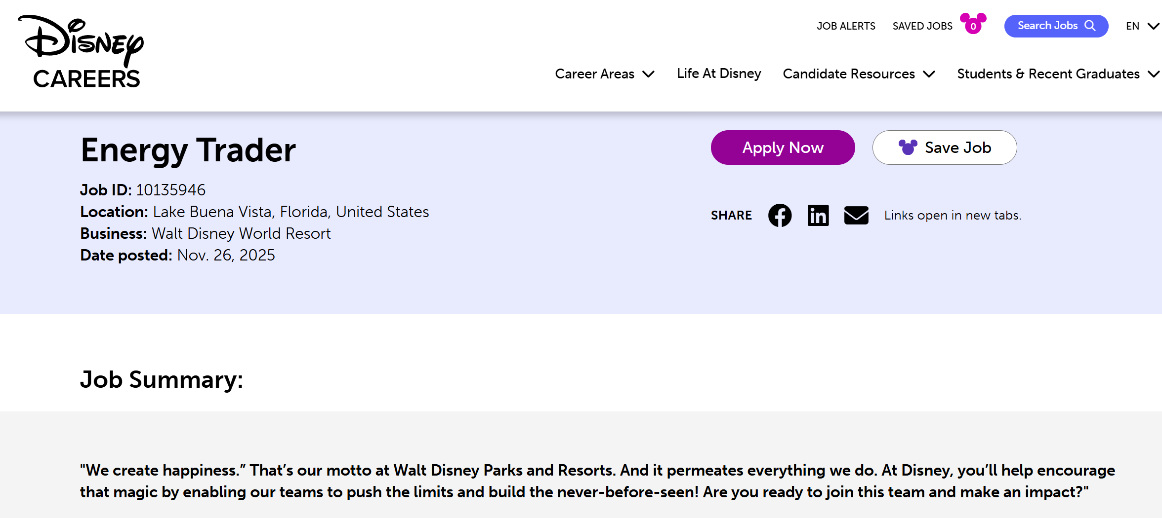 根据公司官网挂出的招聘启事,迪士尼正在招募一名在美国佛罗里达州奥兰多上班的全职能源交易员。