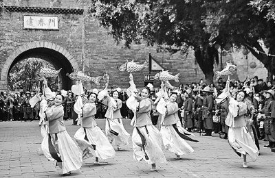 1月1日,江西省赣州市章贡区举行“王师凯旋·福寿虔州”入城仪式,通过场景复原、非遗表演等丰富多彩的迎新活动,丰富群众文化生活,庆祝新年到来。图为演艺人员在进行非遗鲤鱼灯表演。胡江涛摄/光明图片