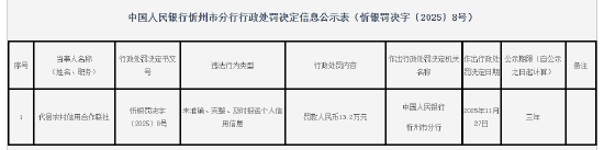 12月3日金融一线消息,据中国人民银行忻州市分行行政处罚决定信息公示表显示,代县农村信用合作联社因未准确、完整、及时报送个人信用信息,被罚款人民币13.2万元。