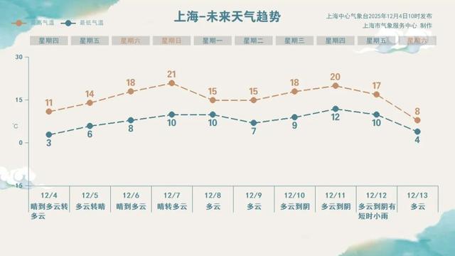 明天(5日)冷空气影响基本结束,上海全天气温在6~14℃之间。双休日迎来大回暖,周日的最高气温可达21℃。下周有两次冷空气过程,出现在下周初和下周末,气温再上演一轮“降-升-降”。下周初冷空气相对较弱,最高气温回落至15℃左右。下周中迅速回暖后,下周末有一股较强冷空气影响。未来十天,气温起起伏伏,大家根据天气变化合理着装,谨防感冒。总体干燥少雨,防火安全依然不能松懈。