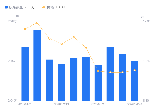 4月22日消息,数据显示,截至2026年4月20日,A股股东总户数为2.16万户,较上期(2026年4月10日)减少225户,降幅1.03%。公司最新A股总股本为5.12亿股,其中流通A股5.12亿股,户均持有流通A股数量为2.37万股,较上期增加244.52股,增幅1.04%;户均持流通A股市值23.79万元,较上期增加4330.39元,增幅1.85%。