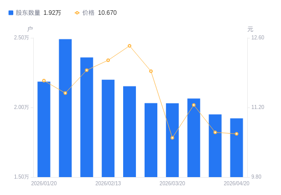 4月22日消息,数据显示,截至2026年4月20日,A股股东总户数为1.92万户,较上期(2026年4月10日)减少286户,降幅1.47%。公司最新A股总股本为2.36亿股,其中流通A股2.36亿股,户均持有流通A股数量为1.23万股,较上期增加179.83股,增幅1.49%;户均持流通A股市值13.09万元,较上期增加1556.22元,增幅1.20%。
