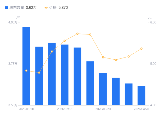 4月22日消息,数据显示,截至2026年4月20日,A股股东总户数为3.62万户,较上期(2026年4月10日)减少150户,降幅0.41%。公司最新A股总股本为6.74亿股,其中流通A股5.37亿股,户均持有流通A股数量为1.49万股,较上期增加61.36股,增幅0.41%;户均持流通A股市值7.98万元,较上期增加3140.76元,增幅4.10%。