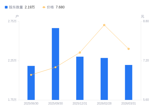 4月23日消息,数据显示,截至2026年3月31日,A股股东总户数为2.19万户,较上期(2026年2月28日)减少893户,降幅3.91%。公司最新A股总股本为4.97亿股,其中流通A股3.67亿股,户均持有流通A股数量为1.67万股,较上期增加654.07股,增幅4.07%;户均持流通A股市值12.85万元,较上期减少1.06万元,降幅7.60%。