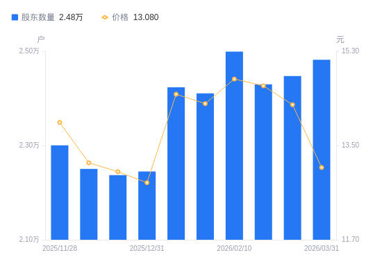 4月23日消息,数据显示,截至2026年3月31日,A股股东总户数为2.48万户,较上期(2026年3月20日)增加344户,增幅1.41%。公司最新A股总股本为5.8亿股,其中流通A股3.38亿股,户均持有流通A股数量为1.36万股,较上期减少191.63股,降幅1.39%;户均持流通A股市值17.83万元,较上期减少1.91万元,降幅9.67%。