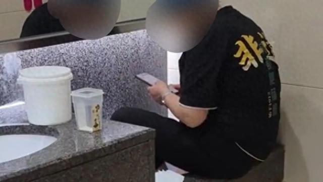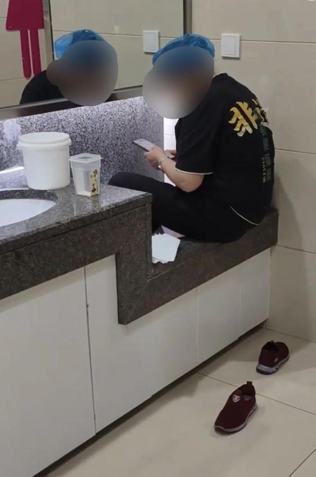 从博主发布的视频来看,该工作人员身穿“非遗成都肥肠粉”的工装,直接坐在卫生间的儿童洗手池上,并将脚伸进洗手盆中。