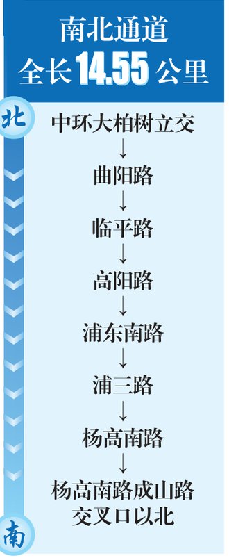 南北通道以上下叠层形式的地道大路为主,建设规模为双向4车道+两侧集散车道,设计速度为60公里/小时,为小客车专用城市主干路。出入口匝道共9处,分别为邯郸路进出口匝道、四平路出口匝道、周家嘴路进出口匝道、海拉尔路进口/临平路出口匝道、浦东大道进出口匝道、张杨路进口匝道、龙阳路进出口匝道、浦三路进出口匝道、成山路进出口匝道。