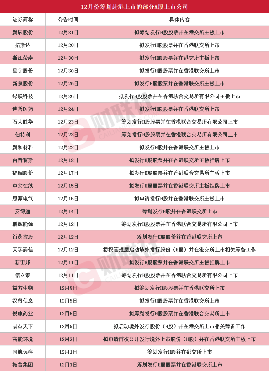 财联社1月2日讯(编辑 平方)A股公司赴港上市热潮延续。据财联社不完全统计,截至发稿,12月份共有27家A股上市公司公告筹划赴港上市,包括、、、、、、、、、、、福瑞股份、、、、、、、、、、、、、、、,详细情况见下图: