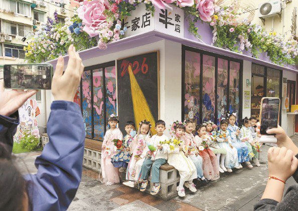 300米长的小街,一排骑楼,80多家商户,人称“小金陵路”,这里就是半淞园路街道西凌家宅路。一个曾经的“老破小”街区,仅用一周时间就筹备了“家门口的花卉节”,并与2026年上海国际花卉节同步开幕,连续9天不间断推出街区营造活动——“花漾西凌·”。