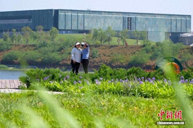 4月25日,正值周末,河南安阳殷墟国家考古遗址公园内春意盎然,吸引众多市民前来打卡拍照,在悠久的历史氛围中乐享春日好时光。图为市民在殷墟国家考古遗址公园与殷墟博物馆合影。中新社记者 李超庆 摄