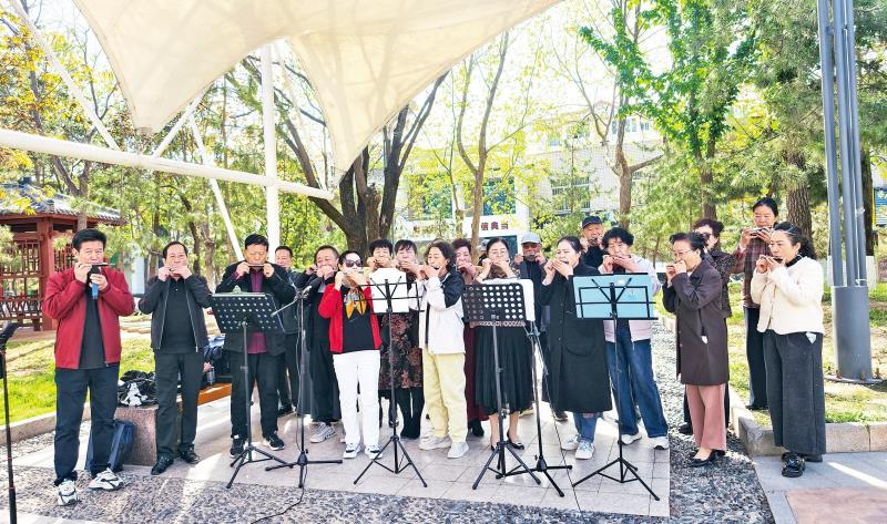 春和景明,琴声悠扬。在新区阳光广场上,市老年大学口琴班的学员们正开展户外教学,用悠扬的合奏声丰富广场文化,也奏出了铜川人的精彩生活。