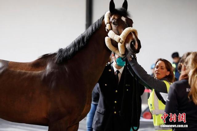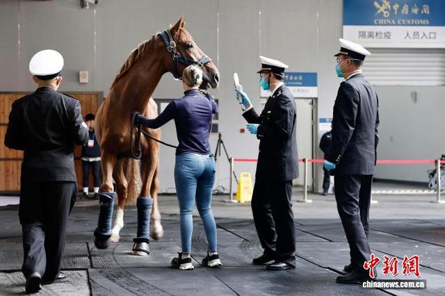 4月26日,海关工作人员对赛马进行检查。当日凌晨2时50分,首批48匹顶级赛马经由专业团队和定制马车的运送,从上海浦东国际机场抵达比赛场馆。据悉,5月1日至5月3日,2026上海浪琴环球马术冠军赛将在上海久事国际马术中心举行,目前赛事各项准备工作已进入冲刺阶段。中新社记者 殷立勤 摄