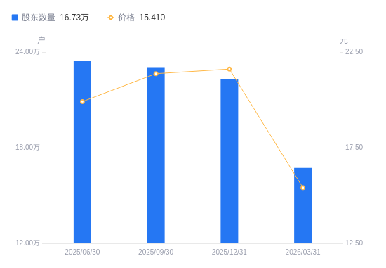 4月26日消息,数据显示,截至2025年12月31日,A股股东总户数为22.31万户,较上期(2025年9月30日)减少7356户,降幅3.19%。公司最新A股总股本为7.08亿股,其中流通A股6亿股,户均持有流通A股数量为2687.9股,较上期增加85.81股,增幅3.30%;户均持流通A股市值5.81万元,较上期增加2478.84元,增幅4.46%。