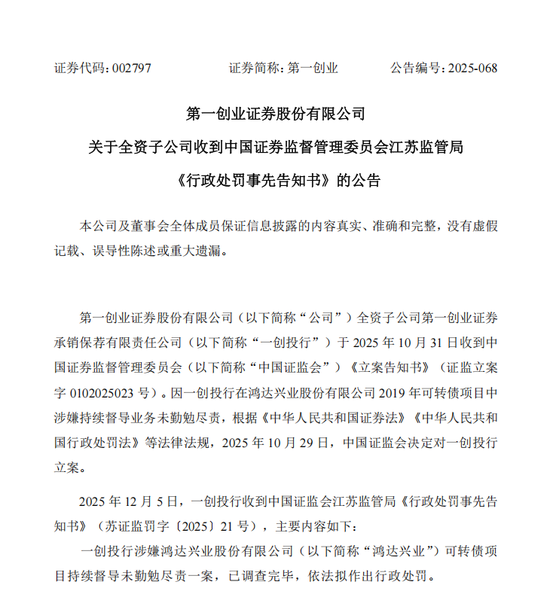 今年12月5日,一创投行收到江苏证监局《行政处罚事先告知书》(苏证监罚字〔2025〕21号),主要内容如下:一创投行涉嫌鸿达兴业可转债项目持续督导未勤勉尽责一案,已调查完毕,依法拟作出行政处罚。