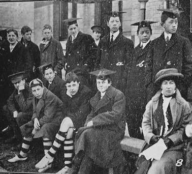 第一张是本地报社所摄照片一帧,记录了三名少年头戴方顶学士帽在学院观看橄榄球赛的场景——此种帽饰直至1960年代始终是学院规定的正式冠冕。