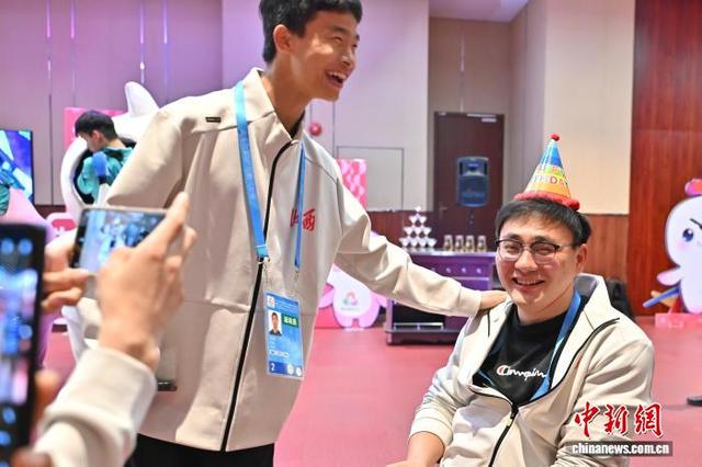 12月10日晚,全国第十二届残疾人运动会暨第九届特殊奥林匹克运动会在广州为恰逢赛事期间过生日的运动员举办生日会,让运动员在紧张赛事之余感受广州饮食文化魅力与暖心关怀。图为山西队李超(右)与队友庆祝生日。中新社记者 陈骥旻 摄
