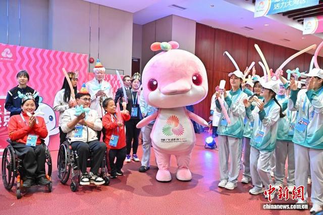 12月10日晚,全国第十二届残疾人运动会暨第九届特殊奥林匹克运动会在广州为恰逢赛事期间过生日的运动员举办生日会,让运动员在紧张赛事之余感受广州饮食文化魅力与暖心关怀。图为赛事吉祥物与志愿者为过生日的运动员庆祝。中新社记者 陈骥旻 摄