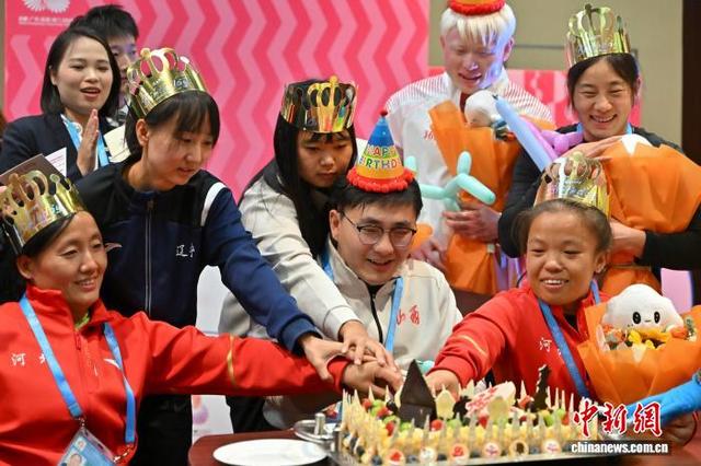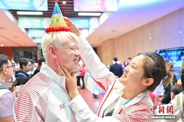 12月10日晚,全国第十二届残疾人运动会暨第九届特殊奥林匹克运动会在广州为恰逢赛事期间过生日的运动员举办生日会,让运动员在紧张赛事之余感受广州饮食文化魅力与暖心关怀。图为吉林队张鑫戴上生日帽。中新社记者 陈骥旻 摄