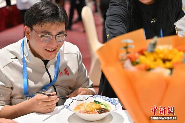 12月10日晚,全国第十二届残疾人运动会暨第九届特殊奥林匹克运动会在广州为恰逢赛事期间过生日的运动员举办生日会,让运动员在紧张赛事之余感受广州饮食文化魅力与暖心关怀。图为山西队李超品尝海鲜长寿面。中新社记者 陈骥旻 摄