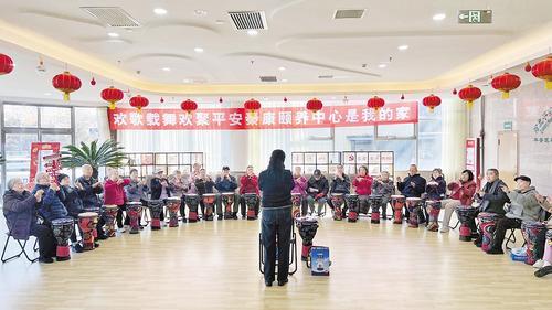 12月2日,在北戴河区平安秦康颐养中心内,老人们在集体学习打手鼓。