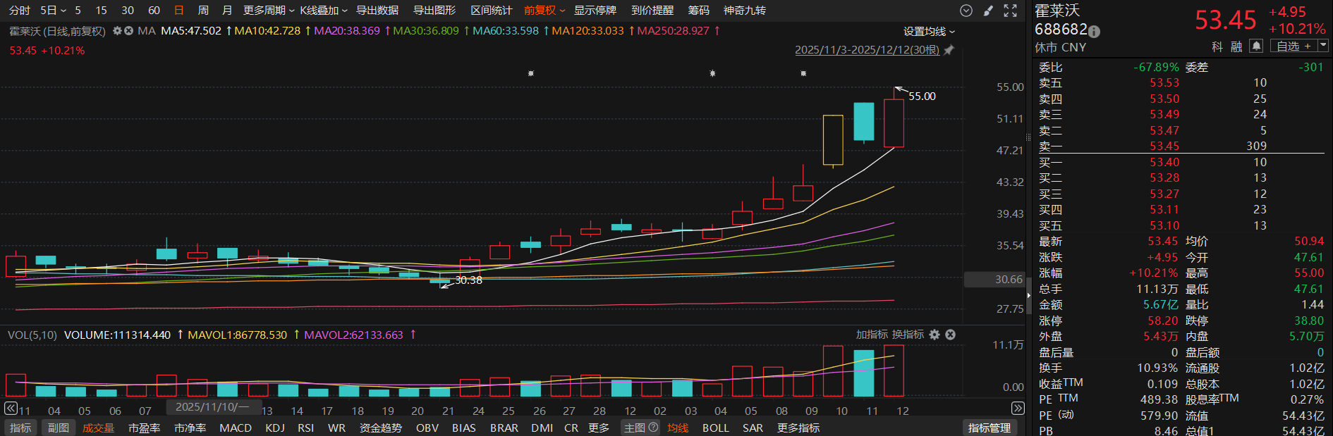 周二发布机构调研纪要表示,公司卫星测试系统业务已构建覆盖“元器件-部组件-分系统-整星”的全链条测试产品矩阵,与集团等体制内卫星研制单位,以及众多体制外卫星制造商、卫星载荷制造商等达成了深度且稳定的合作关系。今年以来,受益于商业航天卫星生产需求的加速推进,公司的卫星测试系统订单高速增长。订单主要来源于商业航天卫星的整星及载荷制造厂商、测试服务机构,其中整星制造商的贡献最大。二级市场上,霍莱沃周三收盘20CM涨停,周五收盘涨超10%。