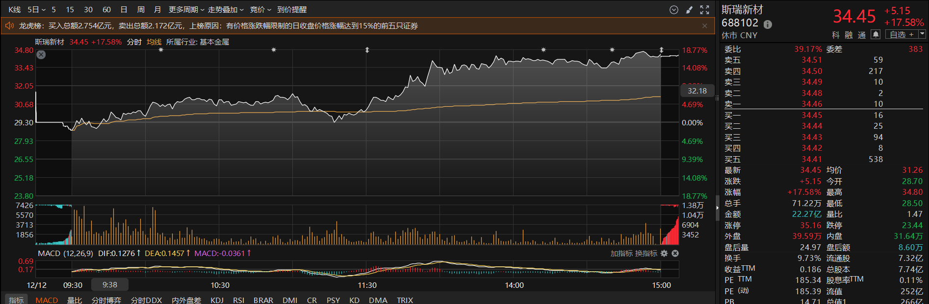 周四发布机构调研纪要表示,公司火箭发动机推力室内壁产品,于2024年助力蓝箭航天朱雀三号VTVL-1可重复使用垂直起降回收试验箭十公里垂直起降飞行试验任务取得成功,九州云箭的液氧甲烷发动机完成10km级飞行的回收试验;于2025年上半年助力蓝箭航天朱雀三号可重复使用运载火箭一级动力系统试车成功。二级市场上,斯瑞新材周五收盘涨超17%。
