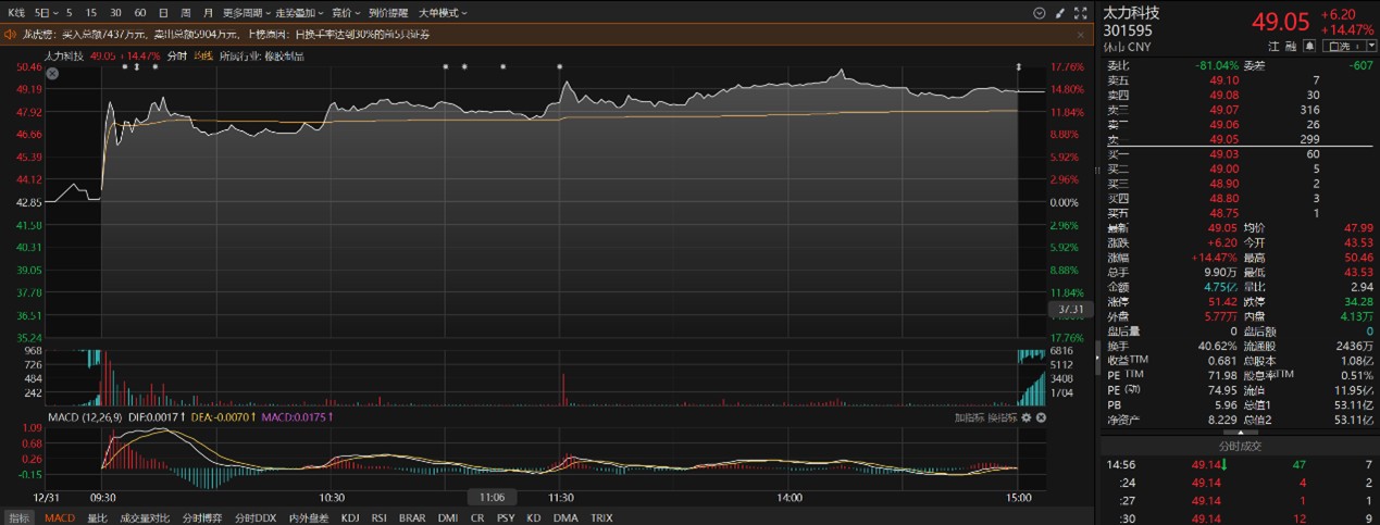 二级市场上,太力科技周三收盘涨超14%。