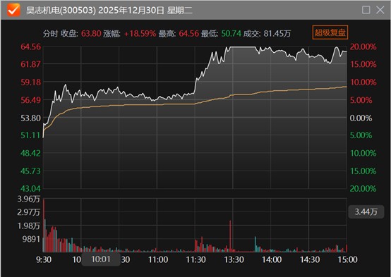 周二发布机构调研纪要表示,公司在商业航天领域已与蓝箭航天开展业务合作,部分产品已在头部商业航天公司实现小批量应用,并形成小幅盈利;同时,公司正与行业内多家潜在客户保持沟通并积极推进市场拓展工作。截至2025年9月30日,公司在、商业航天领域的业务合计占主营业务收入约1%。二级市场上,昊志机电当日盘中20CM涨停,收盘涨超18%。