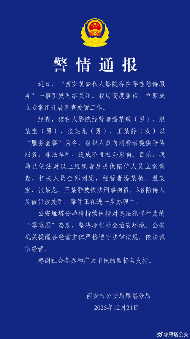 12月21日,西安市公安局雁塔分局针对“西安筑梦私人影院存在异性陪侍服务”一事发布警情通报:4名经营者潘某敏、温某宝、张某龙、王某静被刑拘,3名陪侍人员被行政处罚。