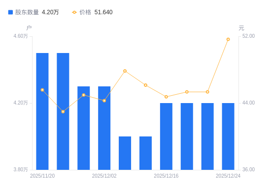 12月25日消息,数据显示,截至2025年12月24日,A股股东总户数为4.2万户,较上期(2025年12月20日)不变。公司最新A股总股本为5.82亿股,其中流通A股5.65亿股,户均持有流通A股数量为1.35万股,较上期不变;户均持流通A股市值69.49万元,较上期增加8.48万元,增幅13.90%。