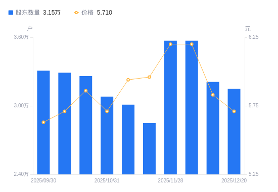 1月6日消息,数据显示,截至2025年12月20日,A股股东总户数为3.15万户,较上期(2025年12月10日)减少600户,降幅1.87%。公司最新A股总股本为5.28亿股,其中流通A股5.28亿股,户均持有流通A股数量为1.68万股,较上期增加313.31股,增幅1.90%;户均持流通A股市值9.57万元,较上期减少184.85元,降幅0.19%。