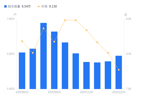 1月6日消息,数据显示,截至2025年12月31日,A股股东总户数为6.55万户,较上期(2025年12月20日)增加90户,增幅0.14%。公司最新A股总股本为10.2亿股,其中流通A股10.14亿股,户均持有流通A股数量为1.55万股,较上期减少21.3股,降幅0.14%;户均持流通A股市值12.62万元,较上期增加136.46元,增幅0.11%。