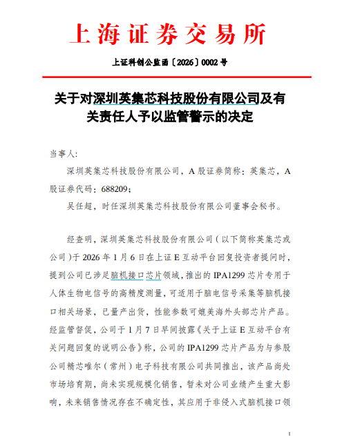 经查明,公司于2026年1月6日在上证E互动平台回复投资者提问时,提到公司已涉足脑机接口芯片领域,推出的IPA1299芯片专用于人体生物电信号的高精度测量,可适用于脑电信号采集等脑机接口相关场景,已量产出货,性能参数可媲美海外头部芯片产品。经监管督促,公司于1月7日早间披露《关于上证E互动平台有关问题回复的说明公告》称,公司的IPA1299芯片产品为与参股公司精芯唯尔(常州)电子科技有限公司共同推出,该产品尚处市场培育期,尚未实现规模化销售,暂未对公司业绩产生重大影响,未来销售情况存在不确定性,其应用于非侵入式脑机接口领域,与当前国际上的侵入式脑机接口存在显著技术路径差异。