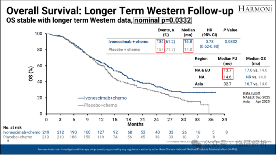 好消息是从后面披露的如果延长对西方患者的随访时间,那么P值(名义P值)将得到显著提升,达到0.0332。坏消息是FDA会不会重视这个长期随访结果,还需要打一个问号,根据公众号临研解析的分析,本研究中PFS与OS大概率为共同主要终点,那这样的话,就需要两个主要终点都达到显著统计学获益。现在OS没有显著获益,影响无疑是巨大的。