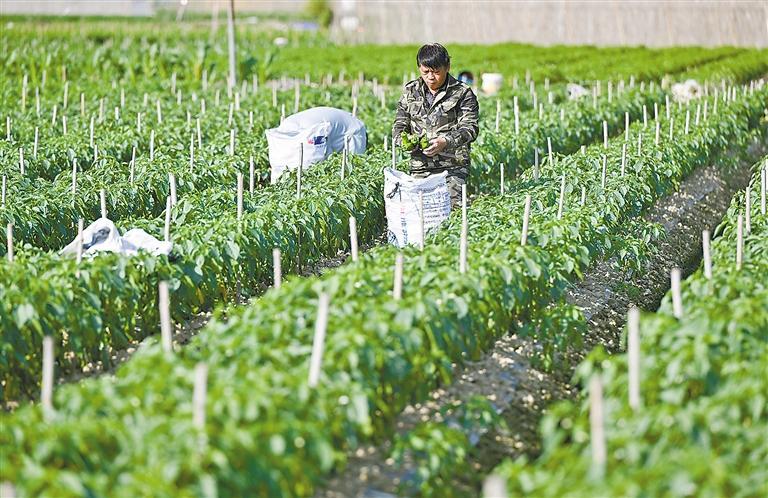 1月8日,农民在海南省澄迈县瑞溪镇金安洋蔬菜种植基地采收辣椒。