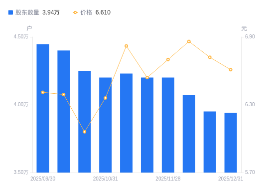 1月9日消息,数据显示,截至2025年12月31日,A股股东总户数为3.94万户,较上期(2025年12月20日)减少100户,降幅0.25%。公司最新A股总股本为7.72亿股,其中流通A股5.71亿股,户均持有流通A股数量为1.45万股,较上期增加36.68股,增幅0.25%;户均持流通A股市值9.58万元,较上期减少1347.12元,降幅1.39%。