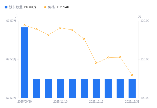 1月9日消息,数据显示,截至2025年12月31日,A股股东总户数为60万户,较上期(2025年12月25日)不变。公司最新A股总股本为38.82亿股,其中流通A股38.81亿股,户均持有流通A股数量为6469.07股,较上期不变;户均持流通A股市值68.53万元,较上期减少3.01万元,降幅4.21%。