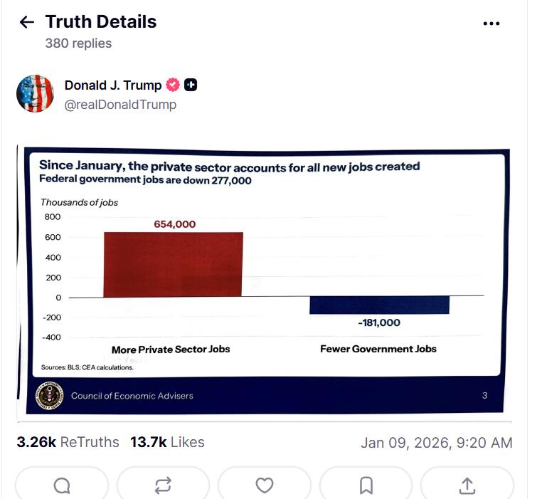 在BLS公布数据前,美东时间1月8日晚8点20分,美国总统在其旗下社交媒体平台上发布的一张图表引发财经界高度关注。该图表包含的私营部门就业数据,与BLS周五公布的私人部门2025年新增就业人数完全吻合。而此时距离官方预定的发布时间早了约12小时,这意味着美国总统至少提前12小时就获得了本应9日才公之于众的12月就业数据,并提前将其曝光。