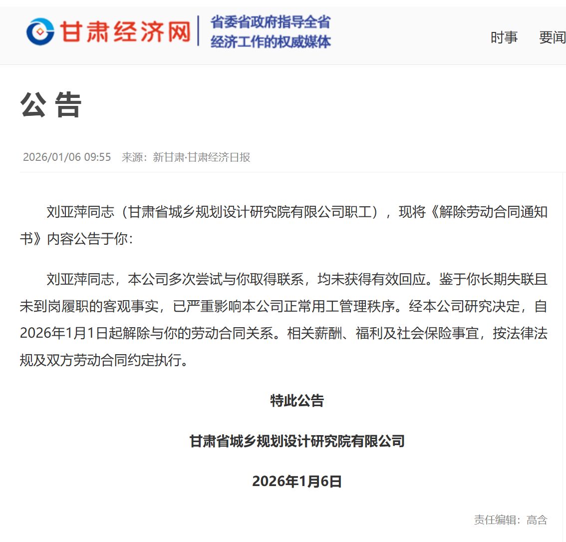 刘亚萍同志(甘肃省城乡规划设计研究院有限公司职工),现将《解除劳动合同通知书》内容公告于你:刘亚萍同志,本公司多次尝试与你取得联系,均未获得有效回应。鉴于你长期失联且未到岗履职的客观事实,已严重影响本公司正常用工管理秩序。经本公司研究决定,自2026年1月1日起解除与你的劳动合同关系。相关薪酬、福利及社会保险事宜,按法律法规及双方劳动合同约定执行。