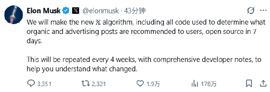 “这项举措将每四周推行一次,同时会附上详尽的开发者说明文档,助力大家了解算法的具体更新内容。” 身为 X 平台所有者的马斯克在该平台发布的一则帖子中如此表示。