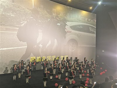 1月10日,花溪区第三小学学生在首映礼上表演节目《让爱传出去》。