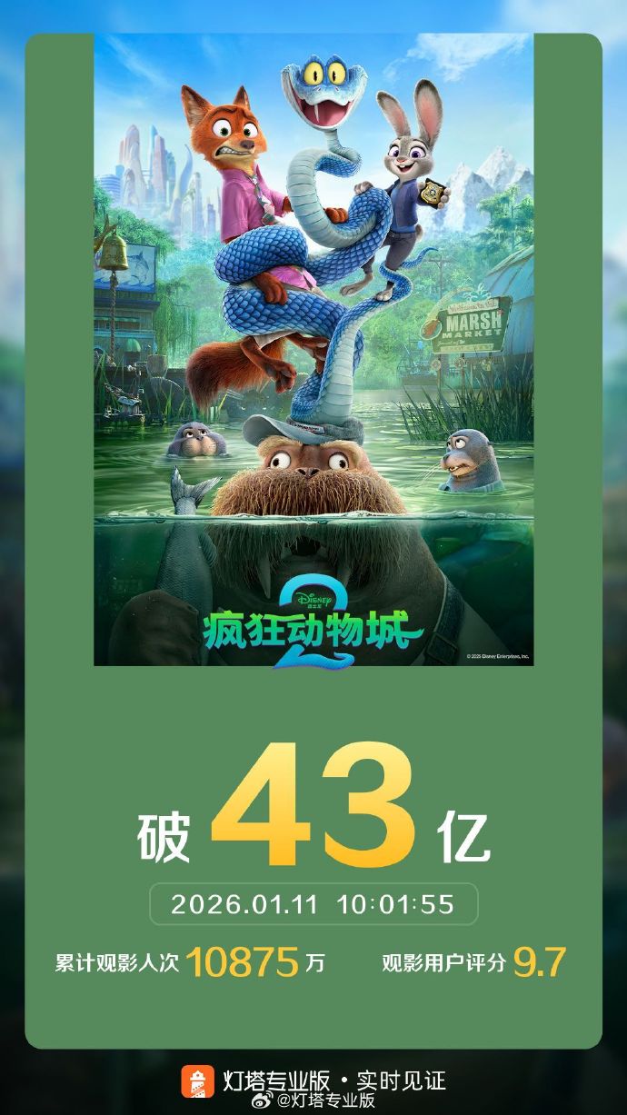 据灯塔专业版实时数据,截至1月11日10时1分,影片《疯狂动物城2》票房突破43亿。