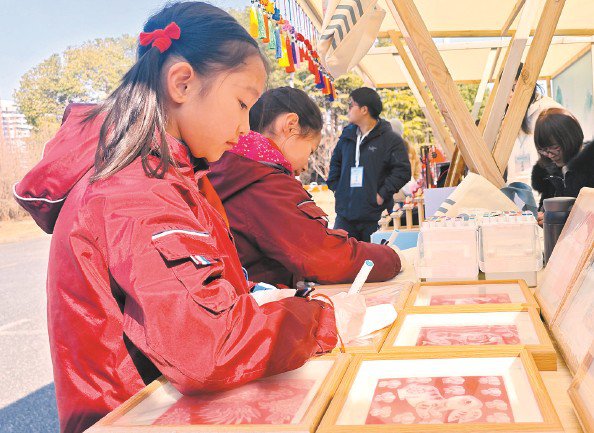 学生在市集学画金山农民画