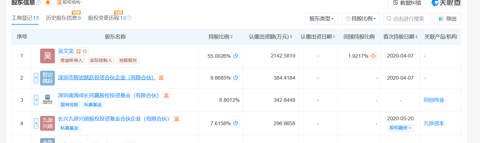 智岩科技由董事长、经理吴文龙持股55%,是公司控股股东,高瓴创投、九派资本等参投。