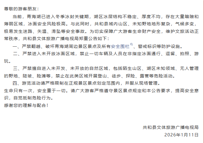 当前,青海湖已进入冬季冰封关键期,湖区冰层结构不稳定、厚度不均,存在大量暗隙和薄弱区域,冰面安全风险极高。与此同时,共和县域内山区、未知野地地形复杂,气候多变,极易发生迷路、失温、滑坠等安全事故。为切实保障广大游客生命财产安全,维护文旅活动正常秩序,共和县文体旅游广播电视局郑重公告如下: